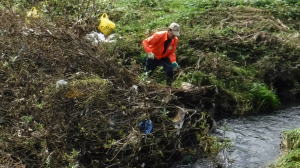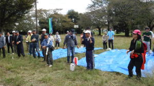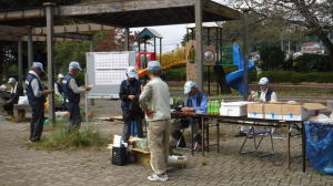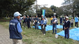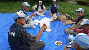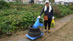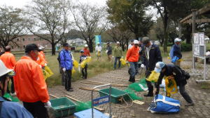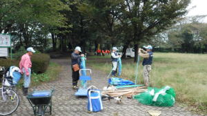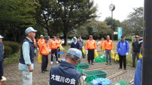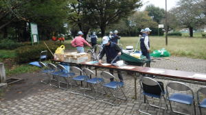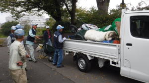 世話役さんのレポート (佐伯さん) 10月13日の予定が台風の影響で延期になり、心配された天気もどうにか大丈夫ということで、決行することになりました。 集合時間前に何人かの会員が風車小屋に集まり、トラックに荷物を積み込み、9時前には荷下ろしも終え会場設営に入りました。延期になったため、市民の皆さん及び会員の参加数も減ってしまったので、当初の6班編成から4班編成に。また、胴長着用者も会員2名、篠籠田町会の若手有志1名と少数精鋭となりました。 会長代行の深津さんの挨拶、作業説明。石田さんリードによるラジオ体操ののち、班ごとに作業場所へ向かいました。台風、前日までの雨の影響もあって、川の水も増水しており、胴長部隊は人数の少ない中、奮戦されていました。陸上部隊も立木や葦などに引っかかったビニール袋などのごみが目立ち、それぞれ足を滑らせながら、懸命にゴミ拾いをされていました。土砂に埋まった自転車やタイヤなどの大物もあり、11時過ぎに大方の作業を終了。 高田緑地のブルーシートに座り、ご苦労さん会が予定通り始まりました。提供されたソーセージとおにぎり、お茶を受け取り、司会の木村さんの進行で参加された団体(シルバー人材センター、篠籠田町会、ヨシザワLA)の代表の方に感想を述べていただき、いよいよビンゴ大会の開始となりました。 景品の吉田農園さんが作られた、無農薬野菜について小林さんから紹介があり、リーチ!ビンゴ!の掛け声と共に、皆さん大喜びで景品を受け取られていました。 最後に河井さんの三本締めでお開きとなりました。後片付けを行い、秋の大掃除は無事終了いたしました。 参加くださった皆様、本当に有難うございました。当会は春と秋の大掃除だけでなく、毎月清掃活動を行っておりますので、当会ホームページをご覧、確認いただき是非ご気軽にご参加くださいますようお願いいたします。 【班編成】
