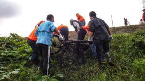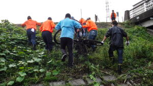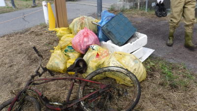 高田橋・両岸上流側: ![]() 黄袋(20)、青袋(12)、タイヤ(3)、ポリタンク(1)、子供自転車車輪(1)、ゴム長靴(2)、コーン(3)、鉄くず(2) 布団、毛布(7)、ダンボール箱(2束) |