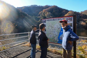 ダム湖の畔でしばし休憩。遠目ですが、まわりの木々の色合いも秋の装いでした。