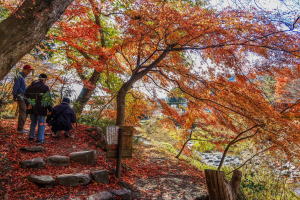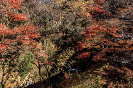 もみじ苑から見える紅葉、かすかに滝 |