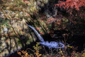 その後、滝に向かい、表からの月待の滝、そして岩場を少し下って浦見の滝を楽しみました。今回の水量はやや少な目の様相で、滝の数は2本でした。 帰路は、もみじ苑から久慈川支流の川沿いウォークで、紅葉狩りしながら車に向かいました。