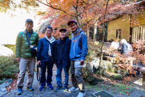 昼時だったので先ずは古風な食事処「もみじ苑」に入り、皆さん十割そばを注文した後、紅葉とその向こうの滝を見ながらの休憩。出てきた十割そばは、河内そば職人が曰く、そば太さが少し不揃いなのでやはり”手打ち”だなぁ、とのことでした。(食べるだけの私には同じ太さに見えましたが)