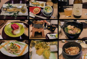 先ずは、お茶を入れて3つあった「お着き菓子」をいただいた後、温泉へ向かい一風呂目をゆ~っくり浴びました。(温泉模様は上記の宿ホームページを参照ください) 次に18時からは夕食でして、日本酒や地ビールも併せて楽しみました。 夕食料理は品数豊富で美味しさ満点、特にきれいな焼き魚「アユ」や五目御飯は私好みでした。この後、二風呂目で体を温めなおし、その後は多々あって、、、不明?。