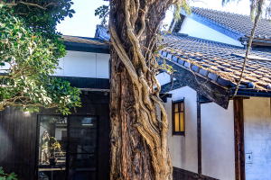 日本酒、梅酒、地ビール、ウィスキー、ワインや、グラス等の多くの土産品がありましたが、会を代表して?河内さんが利き酒チャレンジされていました。 なお、敷地内に大樹にからまったフジのような樹木がありましたが、良い風格でした。