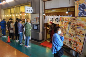 阿字ヶ浦から海岸沿いに南下し、那珂湊漁港に到着。少し魚市場を歩いて、海鮮すし屋さん「海花亭」に入りました。